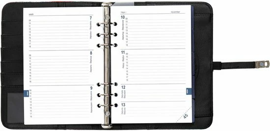 A5 maat hervulbare agenda met gratis meerjarige agendavulling met veel schrijfruimte. Met het stevige ringmechaniek is het gemakkelijk om de indeling van je agenda aan te passen aan jouw manier van werken. Je belangrijke aantekeningen kun je gewoon in je organizer laten, als je straks een nieuwe agenda-vulling toevoegt.