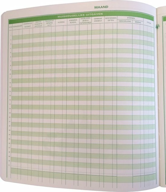 Zo kan u, voor elke maand, aan de linkerpagina de dagelijkse gezinsuitgaven bijhouden zoals uitgaven voor eten, dokters, kledij, dagbladen, zakgeld, geschenken…