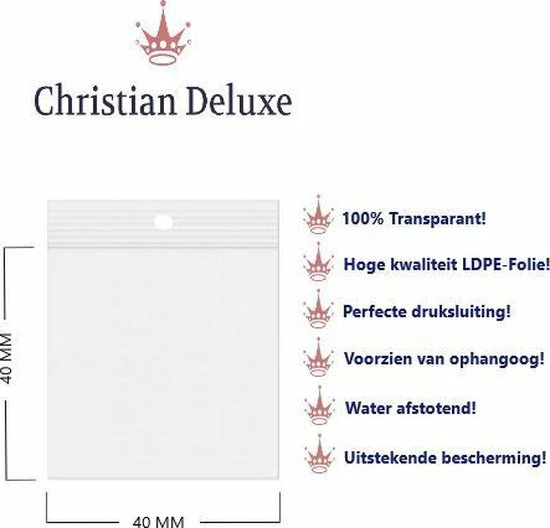 De gripzakjes van Christian Deluxe staan voor 100% kwaliteit. Deze kristalheldere gripzakjes worden gefabriceerd van hoogwaardige LPDE-folie met een dikte van 50 micron, wat zorgt voor extra stevigheid en flexibiliteit.