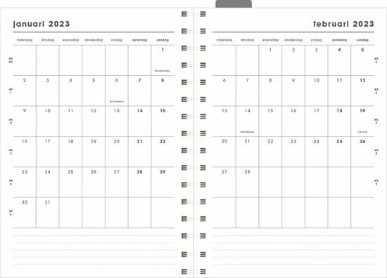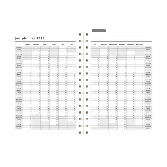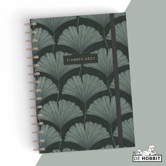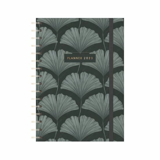 Chique A5 agenda/planner met koperkleurig spiraal. De cover is stijlvol vormgegeven met een dessin van ginkgo’s op een groenblauwe achtergrond. De planner wordt gesloten door een grijze elastieke band. De indeling is één week over twee pagina’s in verticale kolommen. Onderin is een maandkalendertje en ruimte voor andere notities. Als extra heeft deze agenda een maand- en jaarplanner en een verplaatsbare bladwijzer. Deze planner loopt van november 2022 t/m december 2023.