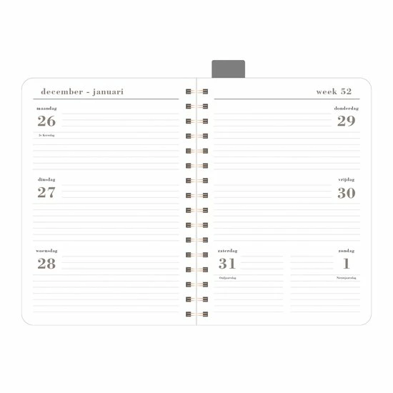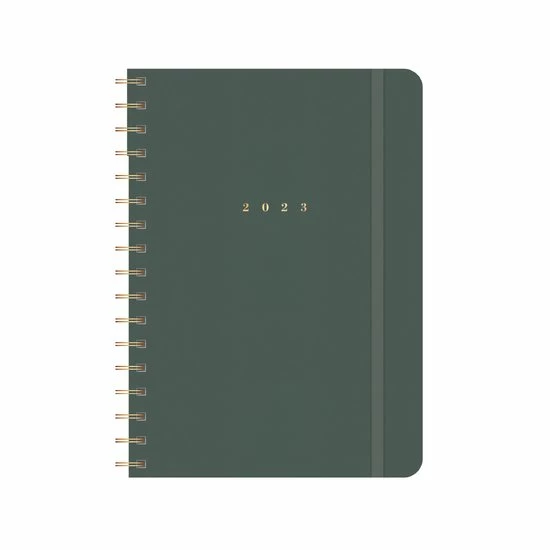 Luxe agenda met een cover van chique grijsgroen suède look en een koperkleurig spiraal. De agenda is ruim en rustig van opzet en wordt gesloten door een grijsgroene elastieke band. De verplaatsbare bladwijzer helpt je snel de juiste pagina te vinden. Dit ruime overzichtelijke exemplaar loopt van oktober 2022 t/m december 2023. * formaat cover: h:21,6cm x b:15,5cm * formaat binnenwerk:h:21cm x b:14,85cm * suède look hardcover met foliedruk, afgeronde hoeken * spiraal * 176 pagina’s * weekoverzicht * elastieke band * bladwijzer Nederlands