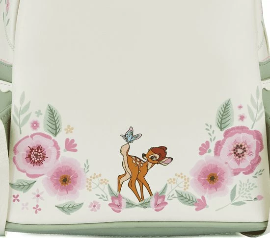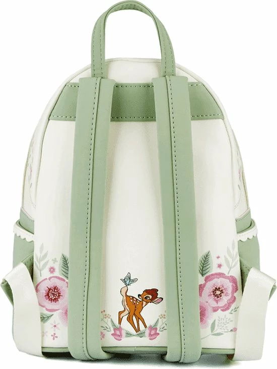 Rugtas Bambi Springtime. Prachtige kunstlederen tas uit de Disney Lente-collectie van het Amerikaanse designermerk Loungefly. De tas heeft een schattige print van Bambi met z’n vriendjes Stampertje en Bloempje. Bloempje staat op het voorvakje. Dit voorvak is voorzien van een ritssluiting en heeft een kunstlederen decoratief strikje. Op de achterzijde van de tas staat Bambi afgebeeld met een vlinder op z’n staart. De tas is voorzien van geborduurde bloem- en bladmotieven, heeft twee verstelbare schouderbanden en een bijpassende binnenvoering.