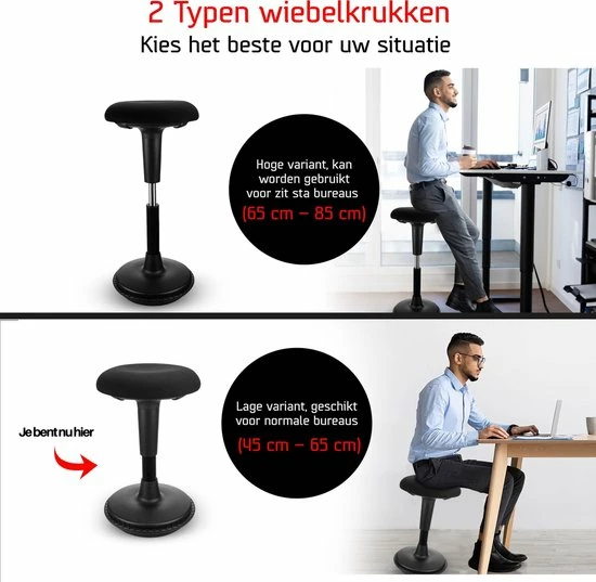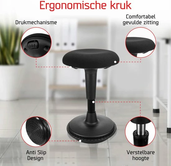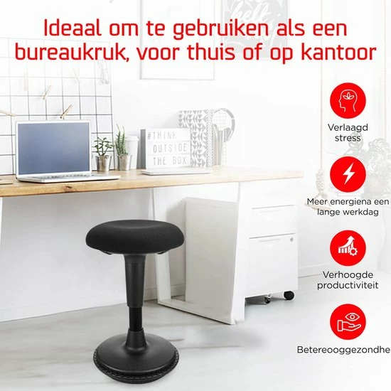 Een ergonomische werkplek is zeer belangrijk, de wiebelkruk kan daar dan ook zeker niet ontbreken als bureaukruk. Tijdens het werken op een wiebelkruk ervaar je minder stress, heb je meer energie, neemt je concentratie toe en ben je productiever dan op een normale stoel. Bovendien zul je na een werkdag op de wiebelkruk zonder nek- en rugklachten en met veel meer energie naar huis gaan.