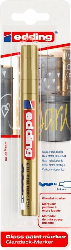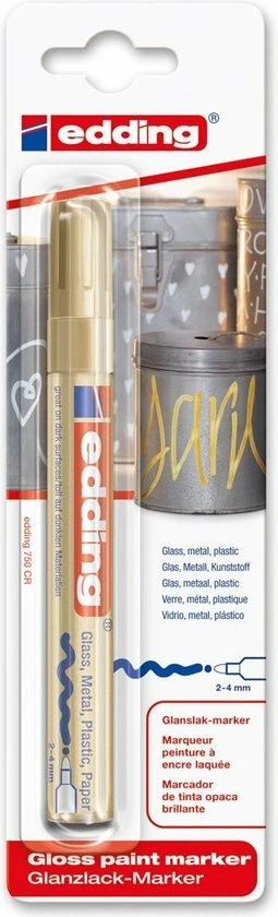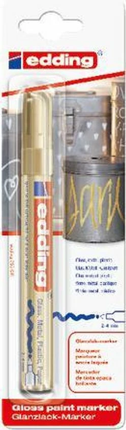 Glanslakmarker voor zeer dekkend, permanent en veegvast schrijven of versieren op gladde – zelfs donkere en transparante – materialen, zoals glas, metaal, kunststof en gecoat papier. De ronde punt heeft een schrijfdikte van 2-4 mm. De verfachtige pigmentinkt is sneldrogend, weerbestendig, extreem lichtbestendig en wrijfvast. Vervangende punten zijn verkrijgbaar. De inkt is reukarm en zonder toevoeging van tolueen/xyleen. Hoogwaardige aluminium barrel.