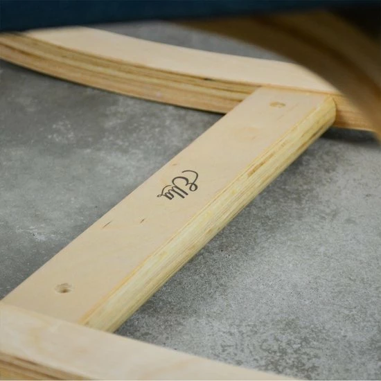 - Kleur: Blank afgewerkt hout met zwarte linnen beklede kussens