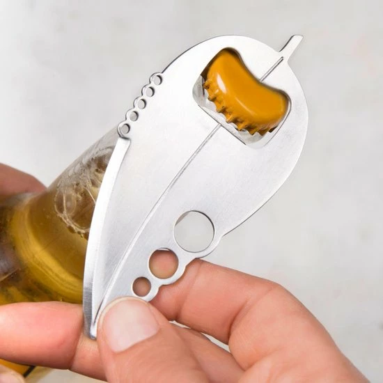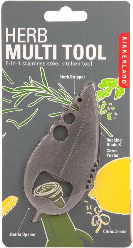 Kruiden multitool van Kikkerland. Multitool om schil te zesten, kruiden van takjes te halen, te pellen en snijden en om bierflesjes te openen. Roestvrij stalen multitool in de vorm van een blad. De Kruiden multitool is een onmisbaar accessoire voor het maken van stoof- en ovenschotels. Het blad is 10,5 x 4,5 x 0,5 centimeter groot.