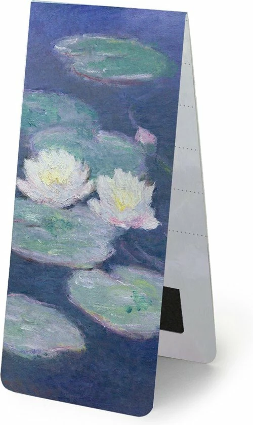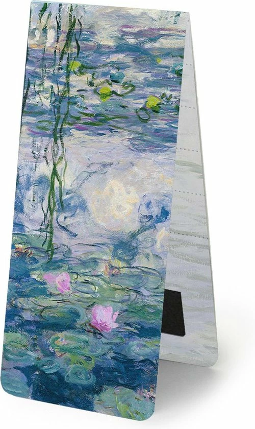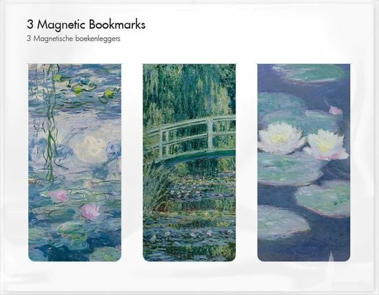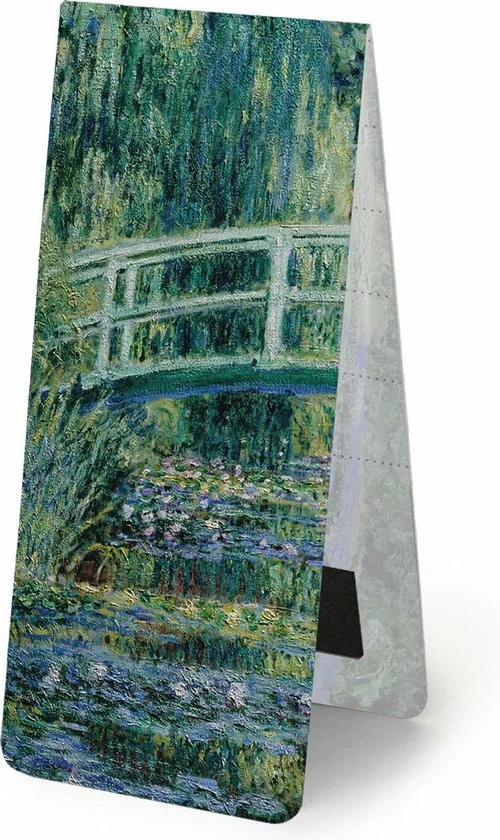 Deze magnetische boekenlegger klemmen om de bladzijden heen en valt zo niet uit uw boek of tijdschrift. De boekenlegger is bedrukt met het meesterwerk van Monet; 2x Waterlelies, Japans bruggetje .