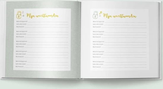 Achterin het boekje is een speciaal katern gemaakt om 100 gebruikersnamen en wachtwoorden te noteren. Je kunt de website/apparaat noteren, de gebruikersnaam en het wachtwoord dat daarbij hoort.