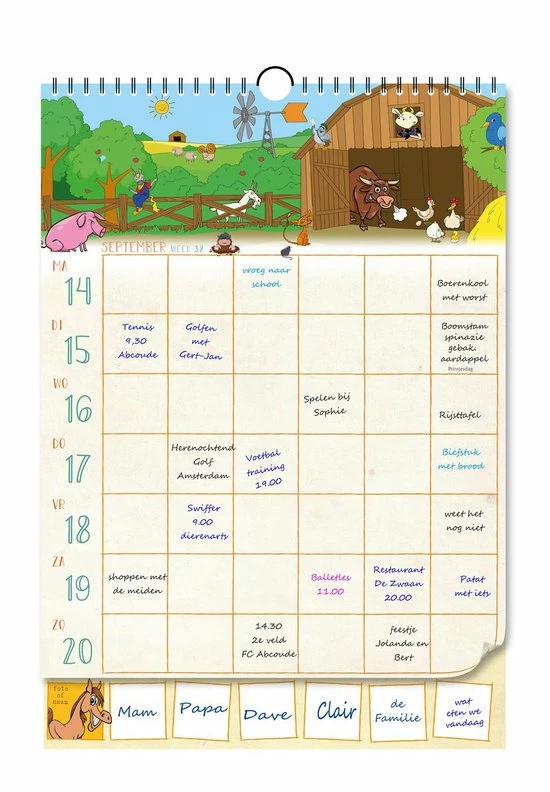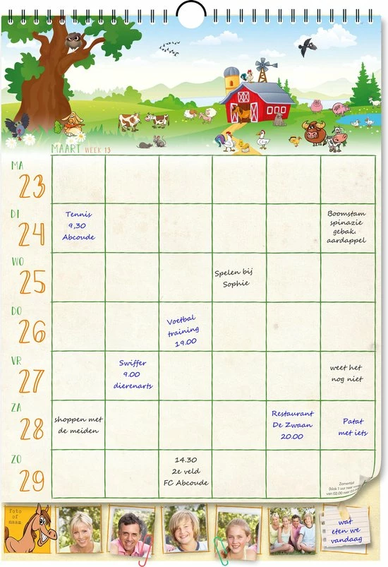 Nooit meer afspraken of werkzaamheden vergeten, sport, hobby, kapper of vrije dagen van school noteren enzovoorts, deze mooie en praktisch ontworpen familieplanner met een duidelijke en overzichtelijke weekindeling met ruimte vlakken om te schrijven om alle afspraken en activiteiten te plannen zodat iedereen van de familie eenvoudig kan zien, wie, wat en wanneer iemand iets te doen heeft.