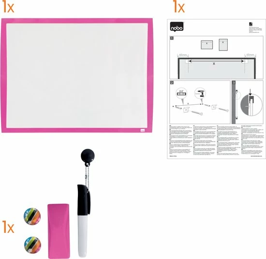 - Inhoud: 1 x Nobo Klein Whiteboard, dimensies: (H x B) 585 x 430 millimeter, Gewicht: 0,81 kilogram, Roze, Inclusief 1 x Mini Marker, Magneten, Wisser en montageset, Nobo Klein Whiteboard, 2104177