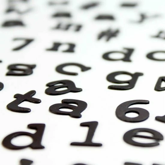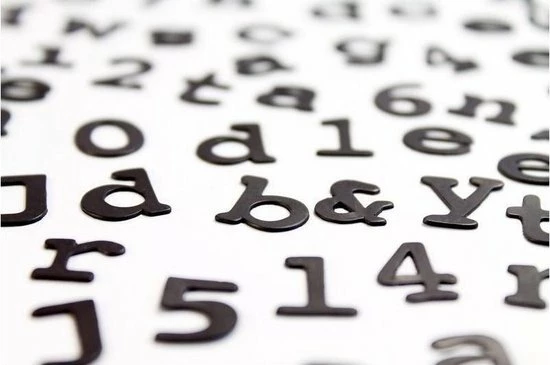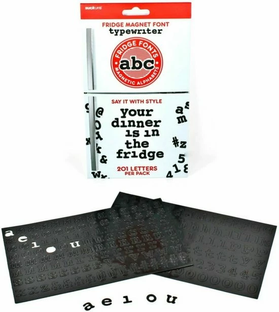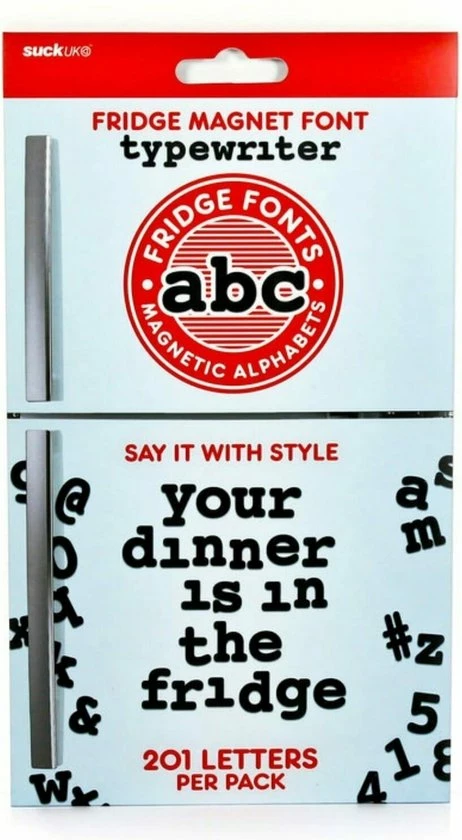 Letter magneten van Suck UK. Set van 201 letter magneten in de stijl van typemachine letters. Alfabet magneten om een boodschap achter te laten op bijvoorbeeld de koelkast of andere metalen objecten. Set van 201 letters, cijfers en symbolen. De letters zijn 1,5 centimeter hoog.