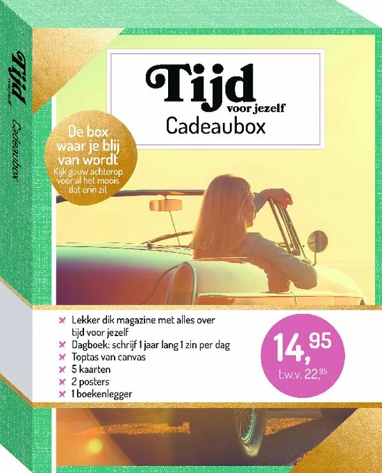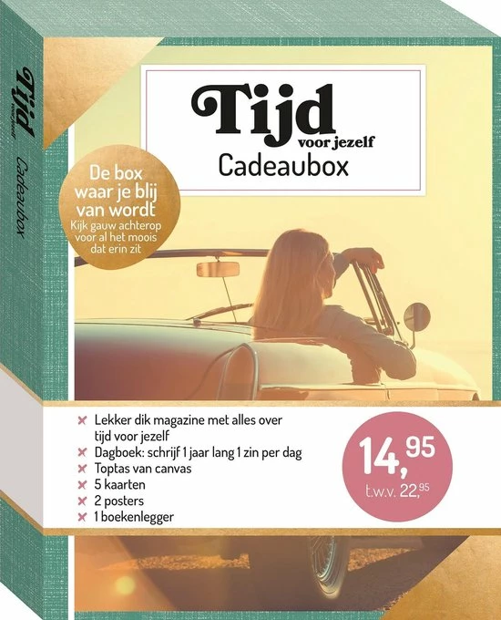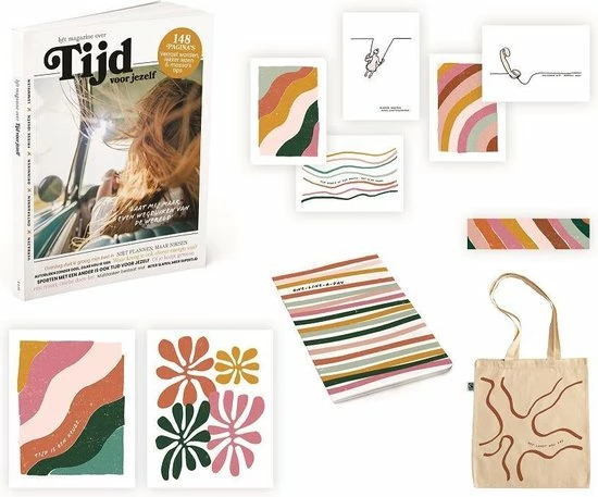 In de Tijd voor Jezelf Cadeaubox vind je een lekker dik magazine van de makers van Flow en Flair waarin je leest wat tijd voor jezelf kan doen en hoe je die tijd regelt. Met handige tips, openhartige interviews en inzichten waar je écht wat aan hebt. Daarnaast zit er in de cadeaubox een 1-regel-per-dag dagboek, posters, kaarten, een boekenlegger en een fijne canvas tas.