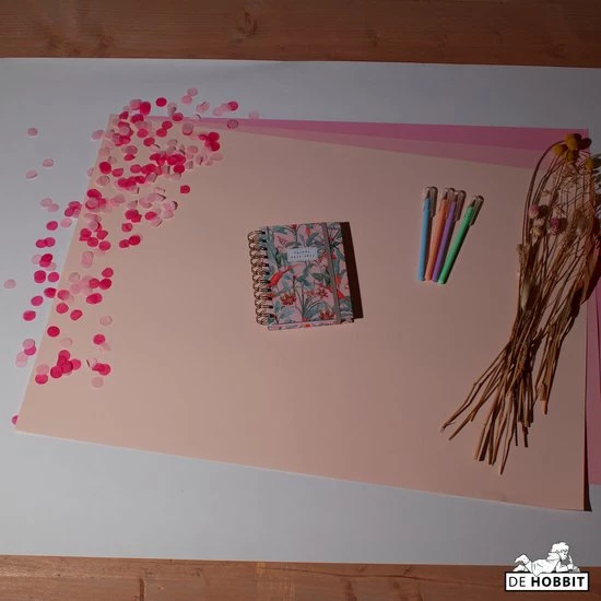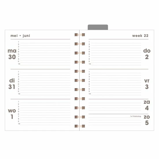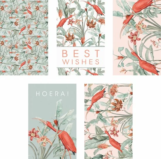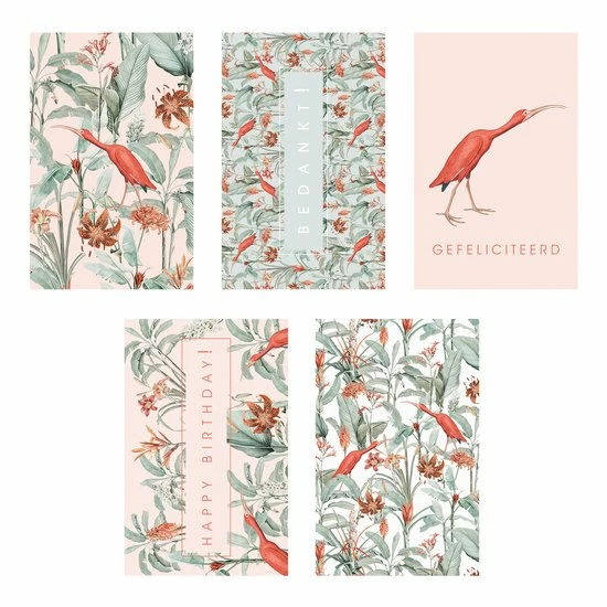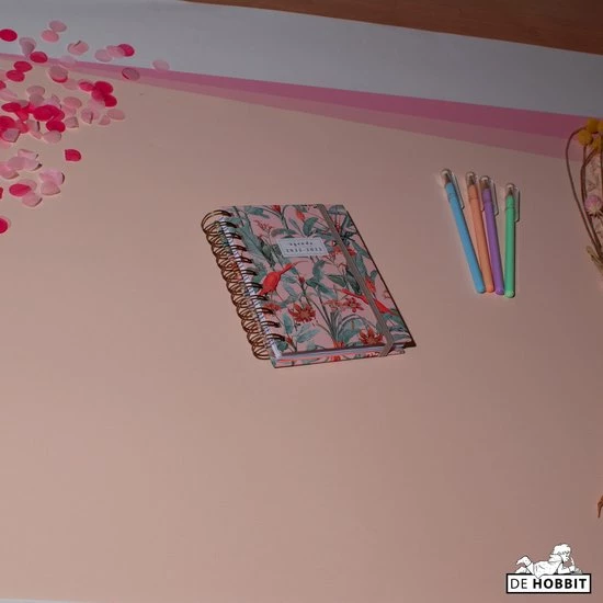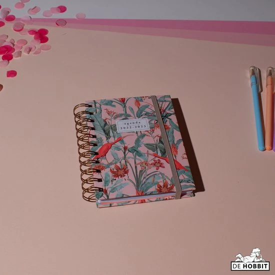 Deze hardcover ringband agenda met soft touch afwerking in A6-formaat heeft een vrolijke print met rode ibissen en tropische bloemen op een zacht roze achtergrond. De agenda wordt dichtgehouden door een elastieken band en heeft een verplaatsbare bladwijzer om de agenda snel bij de juiste datum open te kunnen slaan. Deze agenda heeft 5 transparante insteekhoesjes met tien kleurrijke vrolijke giftcards. De indeling van de agenda is één week over twee pagina’s. Deze agenda loopt van eind mei 2022 tot begin augustus 2023.
