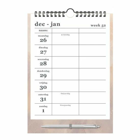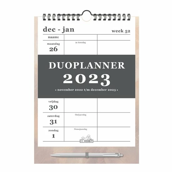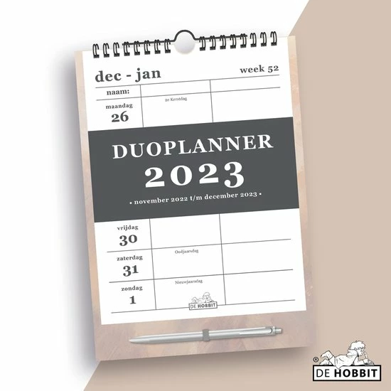 Zijn jullie met z’n tweeën? Dan is deze extra grote duoplanner voor jou. Met zwart spiraal en metalen hanger. De planner hangt op een stevig kartonnen bord met een dessin van verfstreken in zachte tinten. Het papier is wit met de tekst er zwart opgedrukt. Om deze planner in te vullen hebben we er 1 luxe pen bij gedaan. De indeling van deze planner is één week op 1 pagina. De namen kun je bovenaan invullen. De planner loopt van november 2022 t/m december 2023.