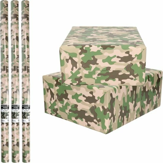 3x Rollen cadeaupapier groen met camouflage motief ook als kaftpapier te gebruiken.