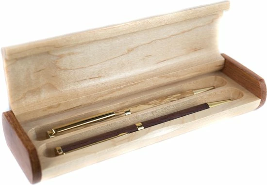 De pennendoos is handgemaakt van uniek Nederlands esdoorn hout in combinatie met met warme Braziliaanse mahonie hout.